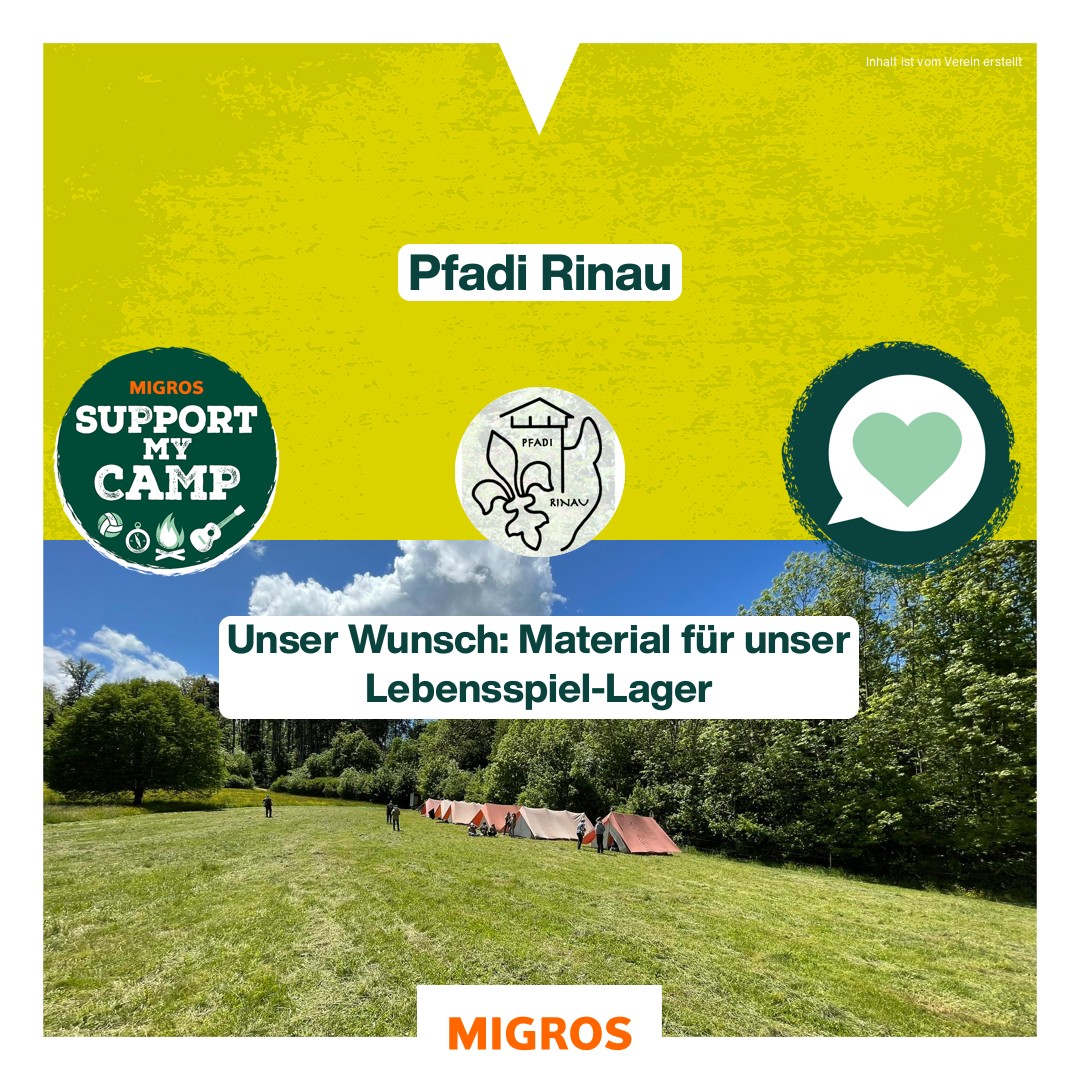 Wir nehmen dieses Jahr an der Migros Aktion Support my Camp teil! Vom 5. Februar bis 15. April 2026 kannst du uns ganz einfach unterstützen, indem du bei deinem Einkauf in einer Migros-Filiale oder online Vereinskarten sammelst und diese unserer Pfadi Rinau zuordnest.